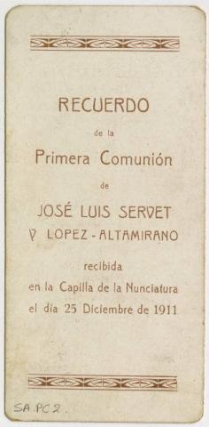Documento de formato rectangular y orientación vertical. Presenta por el anverso una impresión y por el reverso consigna motivo y fecha de creación.