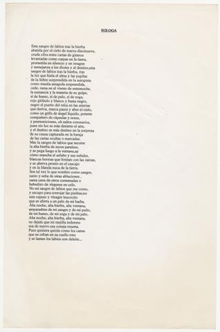 Los cinco poemas del conjunto están mecanografiados, se titulan: "Puertas adentro", "Cerrado por duelo", "Egloga", "Después de leer tanto a César Vallejo" y "Libro".