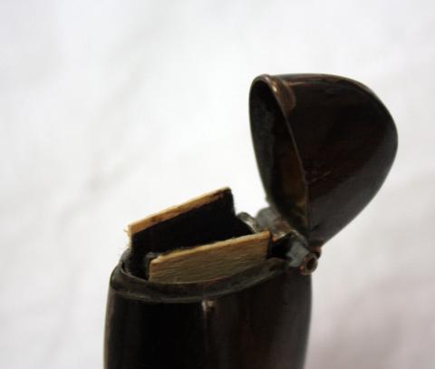 Objeto utilitario de forma alargada y delgado. En uno de sus extremos tiene una pequeña prolongación que genera un ángulo de 90° con respecto al cuerpo alargado. Al final de esta parte, tiene una apertura ensamblada que sirve para guardar objetos de pequeño tamaño en su interior.