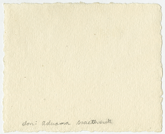 El anverso presenta un bloque de texto impreso con letras de dos tamaños diferentes, mientras que el reverso tiene un texto manuscrito en su parte inferior con información de la persona que donó la pieza