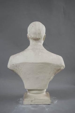 Busto de personaje masculino sobre plinto con cabello corto, frente amplia. Viste chaqueta con solapas, banda con tres guardas, camisa de cuello alto y pajarita.