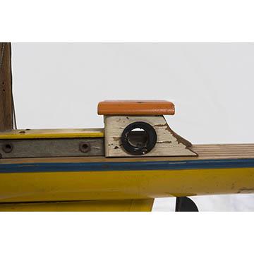 Objeto de uso recreativo, juguete de velero de madera pintada amarila. Se compone por una estructura ovalada con extremo punturagura y el opuesto recto, la parte inferior posee una extensión de forma triangular con un circulo metálico en la parte inferior , la orza del velero; al costado un placa semicircular de plástico negro movible. En la parte superior y al centro una casilla rectangular de madera con una ventana circular, a un costado se eleva verticalmente el mástil de madera con la vela de tela clara triangular anudado con cuerda.