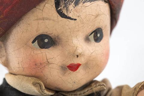 Muñeco articulado en base a alambres y elásticos, vestido con camisa de tela brillante de color beige, sobre la que lleva chaquetilla negra, con lentejuelas cosidas en el frente. Sobre la cabeza lleva un tocado de tela, a modo de turbante, de color rojo con decoraciones amarillas. En la cuna hay un cojín de tela, con relleno y tela blanca con formas geométricas. La cuna tiene formas redondeadas que hace que pueda balancearse y está pintada de color celeste. En dos de sus caras presenta dibujos pintados: la figura de un ave verde sobre una rama con frutos rojos; una escena con dos personajes, un lobo vestido de bailarina y un personaje de espaldas que sostiene una pelota entre sus manos.