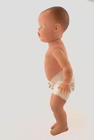 Muñeco articulado semidesnudo, de goma de color anaranjado, cubierto por paño de color blanco tomado con grapa metálica al centro, bajo zona de ombligo. Sus ojos son de color celeste y centro negro adheridos sobre pintura blanca. Su boca está pintada de color rojo y se presenta en forma de letra "o". En la zona del cabello presenta pintura de color marrón rojizo.