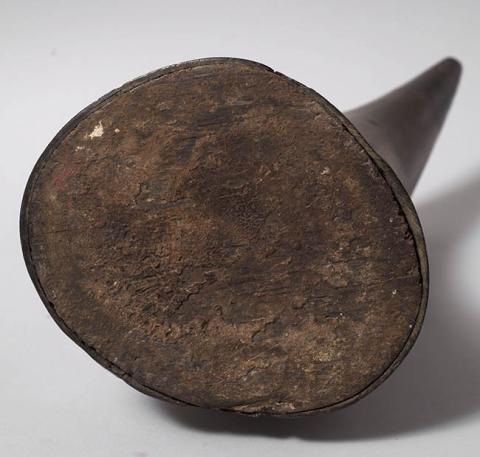 Objeto de forma cónica aguzada en extremo superior, fabricado en madera tallada y pulida, de color marrón oscuro. Presenta clavos en la base que sujetan la capa superficial que recubre el objeto.