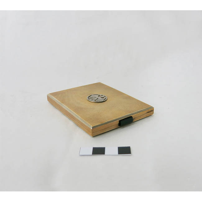 Objeto de uso personal, contenedor de forma rectangular de metal dorado con una decoración ovalada en la parte central.