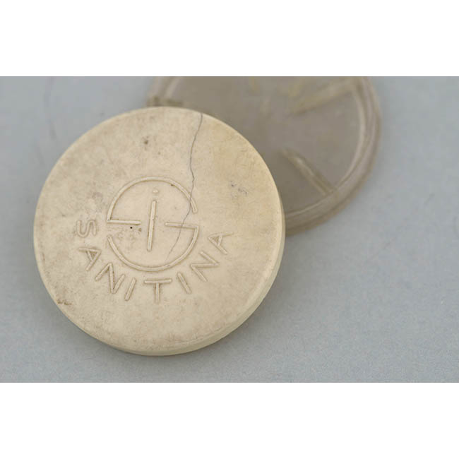 Objeto tridimensional de forma cilíndrica y muy baja altura. Es un contenedor de forma circular, que se compone por una cuerpo de plástico transparente y una tapa blanca con inscripciones en la parte superior.