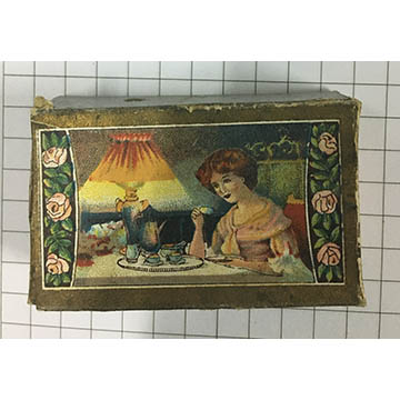 Caja de cartón de forma rectangular y aplanada. Es de color gris aperlado, con flores en la parte superior con letras de color rojo, en la parte frontal se observa una figura femenina de cuerpo entero, vestida con un traje gris con un sombrero. En la mano derecha tiene una tetera y la rodean una serie de tazas con su platillo.