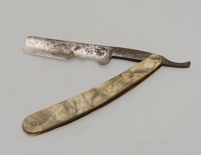 Utensilio para cortar, cuchillo de metal con un mango alargado que se une a una cubierta clara, con interior ahuecado.