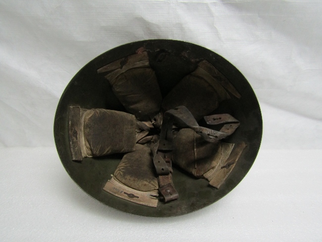 Casco militar color verde oscuro, con escudo chileno ubicado en el costado derecho, con parte inferior roja, parte superior azul y estrella blanca al medio. Al interior, almohadillas de cuero.