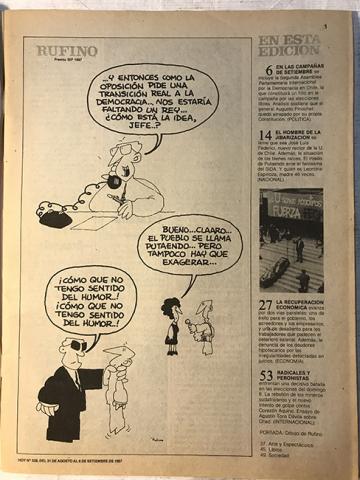 Objeto rectangular, en disposición vertical. Tapa y contratapa de papel couche. En anverso textos impresos en diferentes tamaños y colores ( blanco, rojo y negro). En parte superior texto en blanco y negro sobre fondo verde. En esquina superior derecha texto en negro y rojo sobre rectángulo amarillo. En parte central ilustración, fotografía y texto en blanco sobre fondo rojo. En interior, papel con diferentes textos (artículos, opiniones, reportajes, entrevistas, noticias, etc.) impresos en tinta negra. Además, dibujos, fotografias, ilustraciones y caricaturas impresas. (Se destacan los dibujantes Rufino, Hervi y Amengual). 64 páginas.