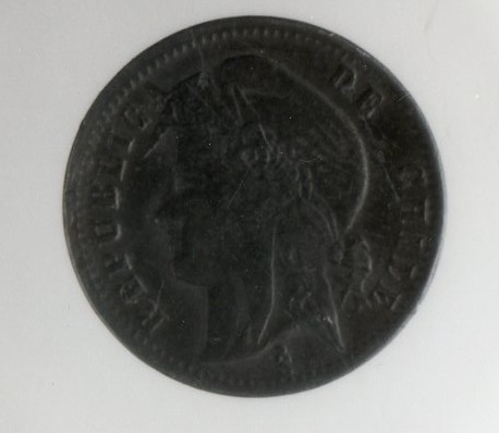 Objeto metálico de formato circular. En el anverso aparece la inscripción MEDIO / CENTAVO al medio, al interior de una circunferencia. Le rodea una leyenda. . Al reverso, una mujer figurando la libertad, con gorro frigio y corona de espigas, flores y laureles.