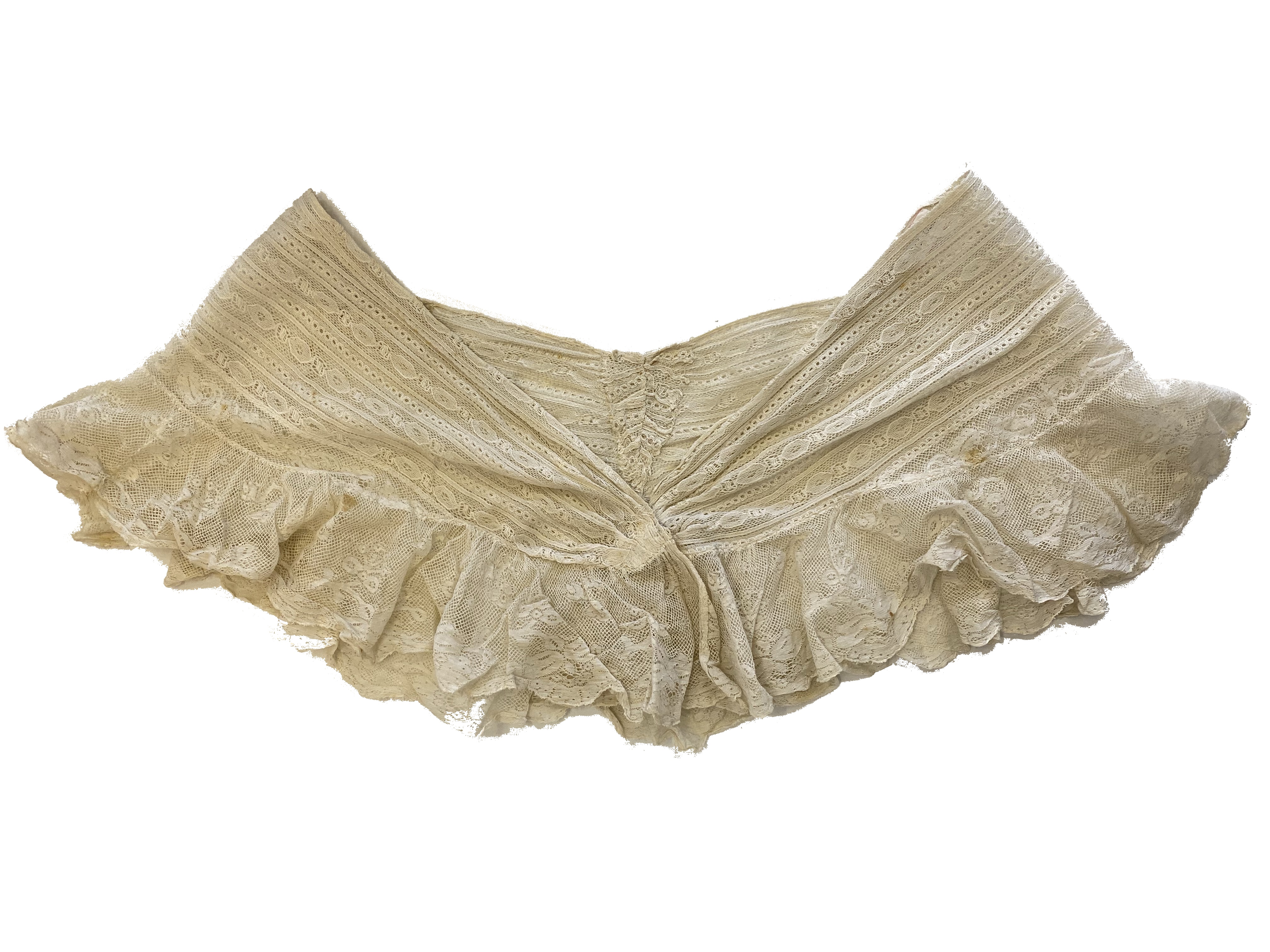 Cuello de color marfil de algodón con encaje. En todo el borde tiene adherido otro encaje con vuelos con motivos florales (encaje Valenciennes).