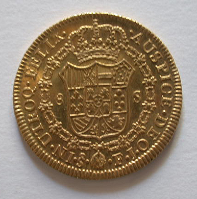 Circunferencia acuñada por un lado con busto de hombre y por otro con escudo. Letras por el borde en ambos lados. Color dorado