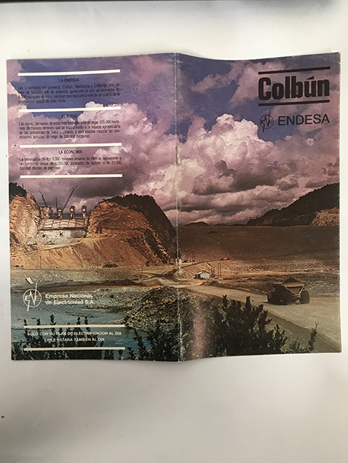 Pequeño trabajo impreso. Objeto de forma rectangular en disposición vertical. Papel couche plegado, con corchetes en el pliegue, impreso con tintas de color. En anverso y reverso fotografía de construcción de hidroelévtrica. En anverso, parte superior derecha Título. En reverso diferentes textos. En interior mapas, ilustraciones, fotografías, gráficos y textos.