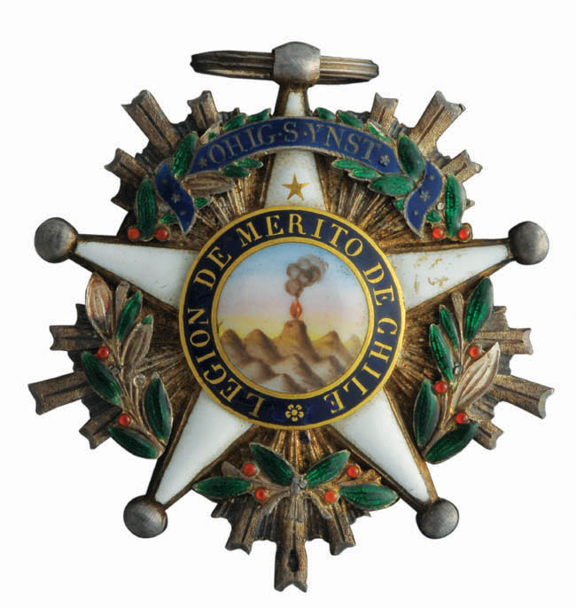 Medalla chilena compuesta por insignia en base a una figura central de estrella de cinco puntas, de color blanco, rodeada por guirnalda de laureles y frutos rojos, tras la que hay rayos dorados. Por el anverso y al centro de la estrella, circunscrito a un círculo, la imagen de un monumento correspondiente a un obelisco, rodeado por un texto: HONOR Y PREMIO AL PATRIOTISMO. En la punta superior de la estrella, una cinta azul con la leyenda: LIBERTAD. Al reverso, la misma figura estrellada con círculo en el que se grafica un volcán en erupción en el contexto de montañas. Alrededor texto: LEGION DE MERITO DE CHILE. En la cinta azul de la parte superior de la medalla, el texto: OHIG.S.YNST.