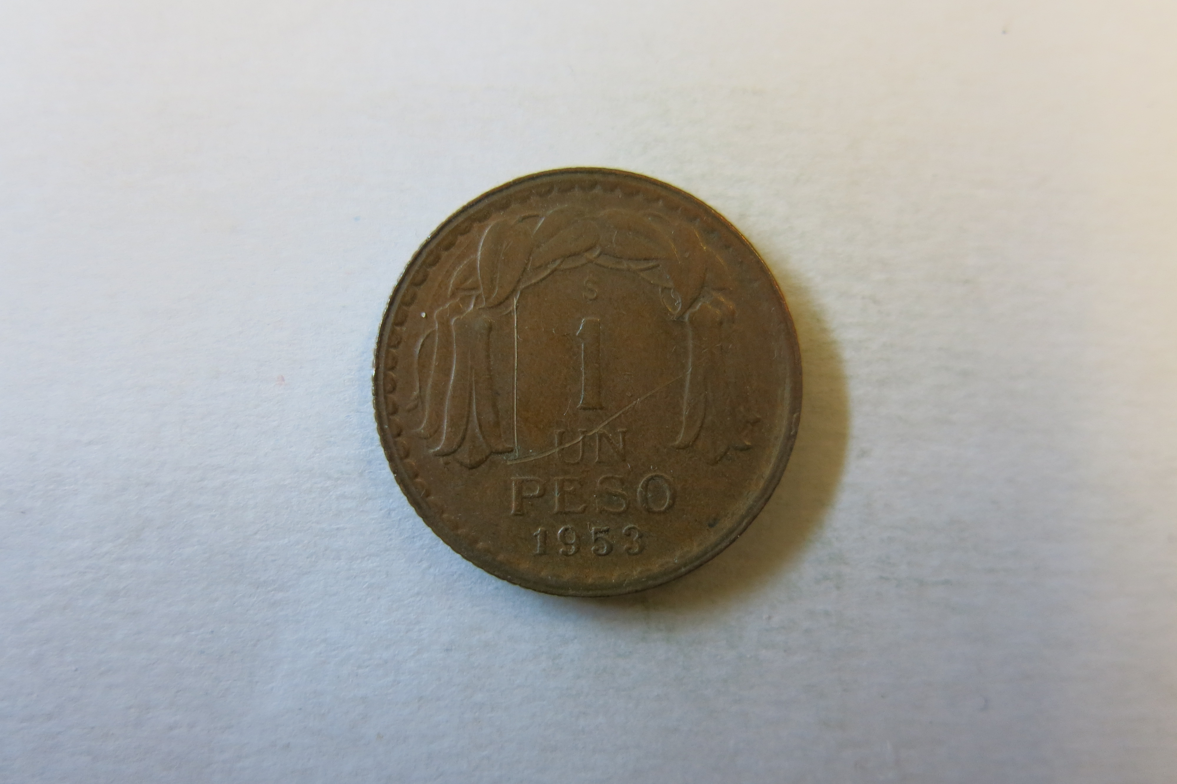Moneda de curso legal de la República de Chile de 1 peso, de forma circular. Anverso: retrato de Bernardo O'Higgins, conocido como el padre de la patria. Leyenda circular externa REPUBLICA DE CHILE. Al lado derecho del perfil se encuentra la leyenda BERNARDO O'HIGGINS y al lado izquierdo del efigie . Reverso: leyenda central 1 PESO 1953. Rodeada en su parte superior por una corona de copihues, flor nacional de Chile. Sobre el uno se encuentra la marca de Ceca. Canto estriado y grafila de medio círculo.