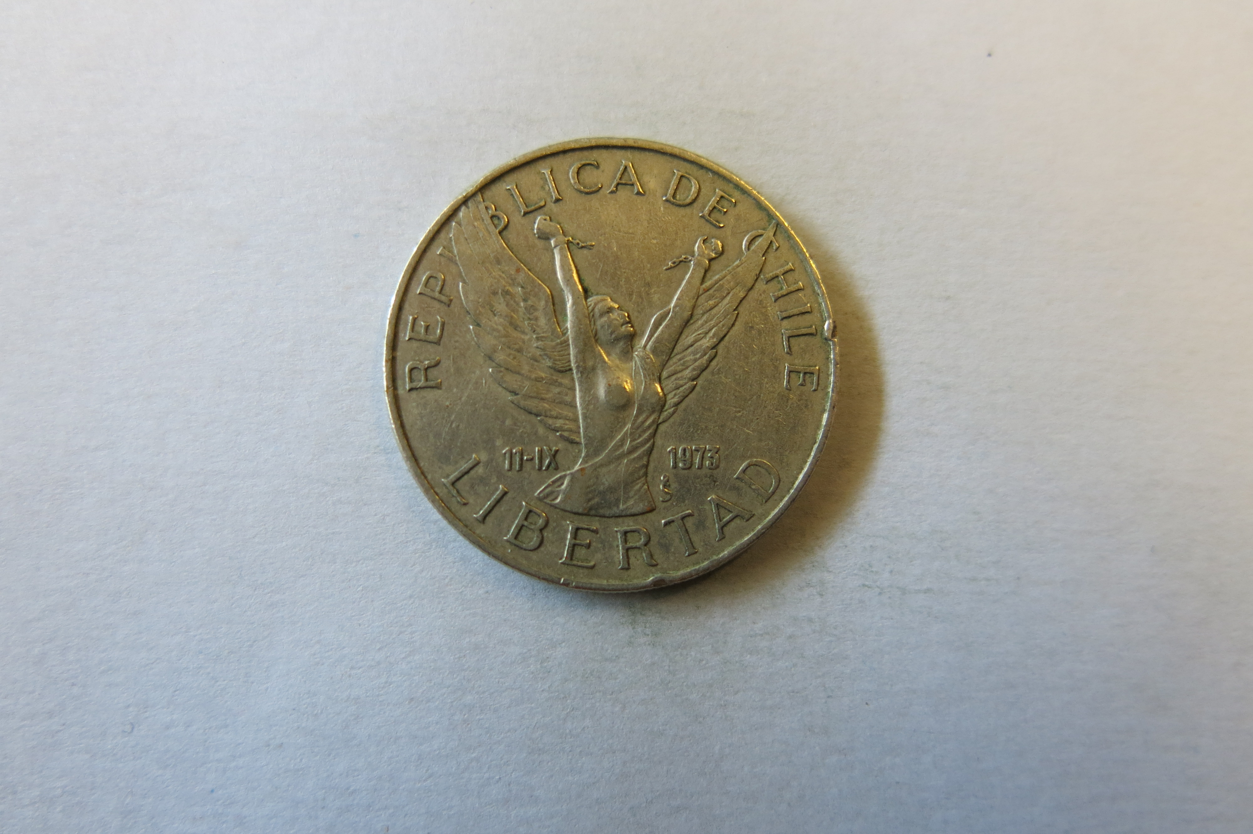 Moneda de curso legal de la República de Chile de 10 pesos, de forma circular. Anverso: figura alada con sus brazos extendidos de forma vertical hacia arriba rompiendo cadenas de sus muñecas que representa la libertad. Leyenda circular externa REPUBLICA DE CHILE. LIBERTAD. Al lado derecho de la figura presenta la leyenda 11-IX, y al lado izquierdo 1973. Reverso: leyenda central 10 PESOS 1978. Rodeada por una corona formada por hojas de laurel conocida como corona triunfal. Canto estriado y grafila lisa.