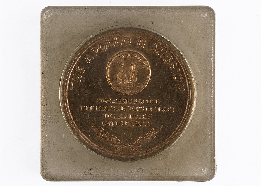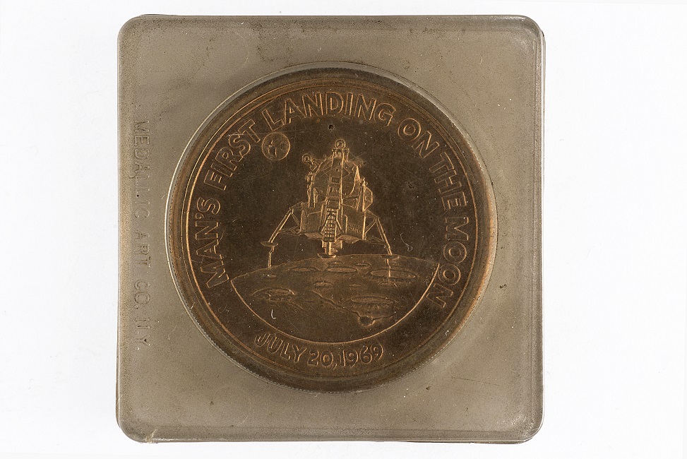 Conjunto conmemorativo compuesto por una medalla y su contenedor. Medalla de forma circular. Anverso: Imagen del Módulo Lunar del Apolo 11 sobre la luna, diagonal a este y en la parte superior se ve el planeta tierra. La imagen se encuentra rodeada por la leyenda MAN'S FIRST LANDING ON THE MOON JULY 20, 1969. Reverso: En la parte superior de forma arqueada presenta la leyenda: THE APOLLO 11 MISSION, bajo esta leyenda en un círculo hay una imagen de una águila sobre suelo lunar. Bajo la imagen, y en la parte central de la medalla, se encuentra una leyenda, COMMEMORATING THE HISTORIC FIRST FLIGHT TO LAND MEN ON THE MOON. Grafila y canto liso.