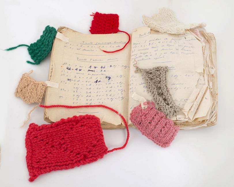Muestrario de puntos de tejido a palillo. El contenido está escrito a mano, y fue utilizado en diferentes épocas. Contiene instrucciones de como realizar diferentes puntos de tejido a palillo. Contiene muestras de los tejidos en diversas lanas de múltiples colores y algunas hojas sueltas con anotaciones variadas en todo tipo de papelería.