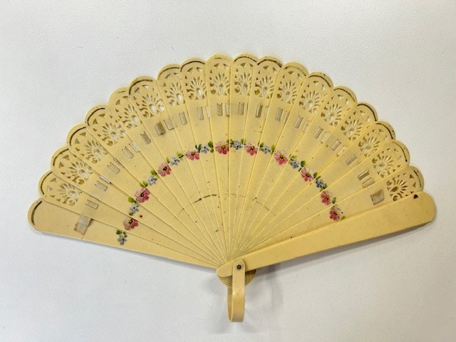 Abanico pequeño de material sintético color crema, con calados y pequeñas flores pintadas a mano, en colores rosados y celeste. Tiene 21 varillas, en total.