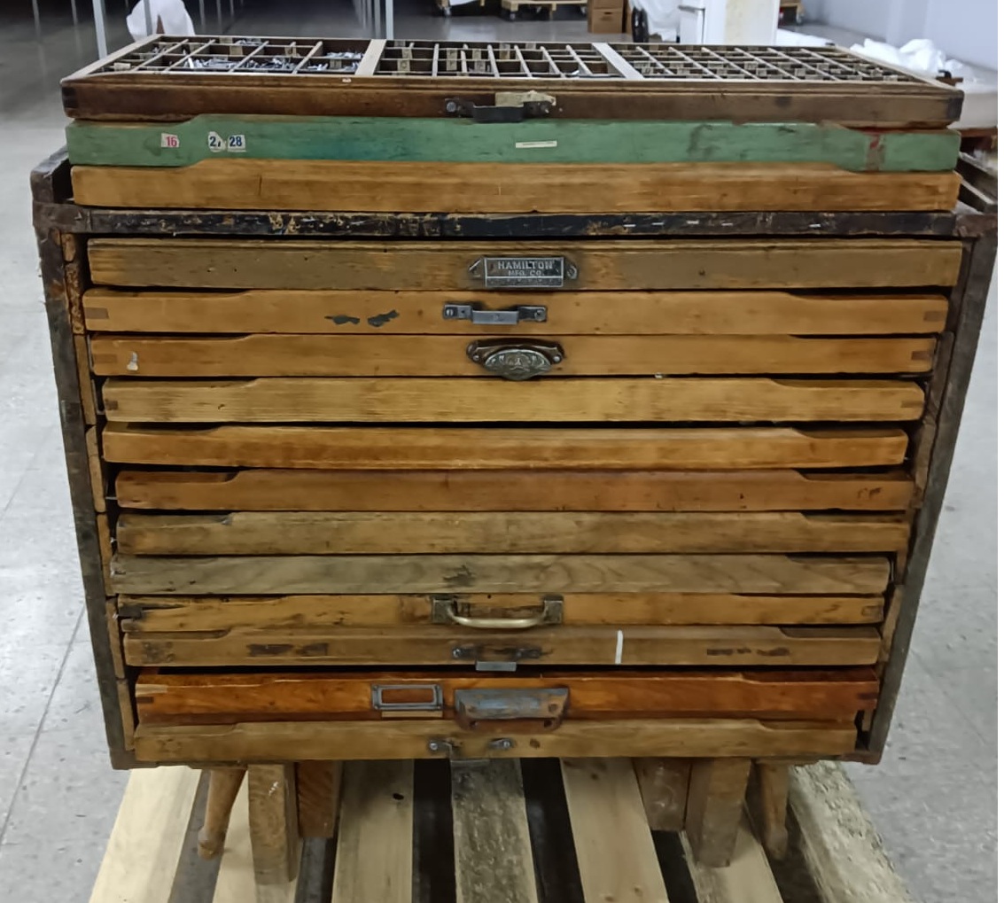 Mesón de madera rectangular compuesto por 15 bandejas. Estas contienen el alfabeto y caracteres ortográficos móviles en diferentes fuentes de letras, para ser usados en imprentas manuales.
