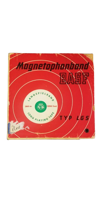 Objeto de uso doméstico compuesto por dos piezas, una cinta magnética y su caja. La cinta magnética está enrollada en un soporte plástico de forma circular con anverso y reverso, en ambos hay un papel adhesivo impreso de color rojo con letras blancas y otro papel adhesivo de color blanco impreso en verde por un lado e impreso en rojo. La caja es un recipiente de forma rectangular de cartón impreso en colores verde, negro y rojo.