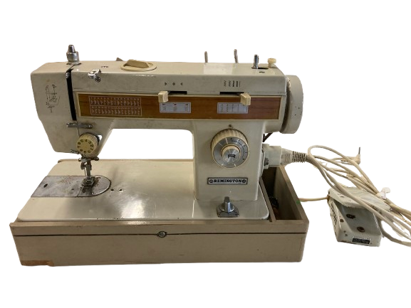 Objeto de uso doméstico. Base plana y rectangular de madera sobre la que se presenta una estructura metálica . Presenta una pieza circular móvil que activa el mecanismo de la máquina a través de un pedal eléctrico.