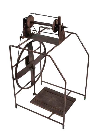 Instrumento metálico compuesto por una rueda ubicada sobre una base unida a un pedal ubicado en la parte inferior. En la parte superior aparece un carrete donde se enrolla  el hilo. Se soporta sobre una estructura metálica de cuatro patas.