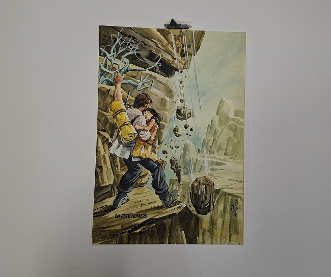 Obra visual de formato rectangular y disposición vertical. Dibujo policromado. En el primer plano de la composición una figura masculina sosteniendo en sus brazos una figura infantil. De fondo, paisaje rocoso.