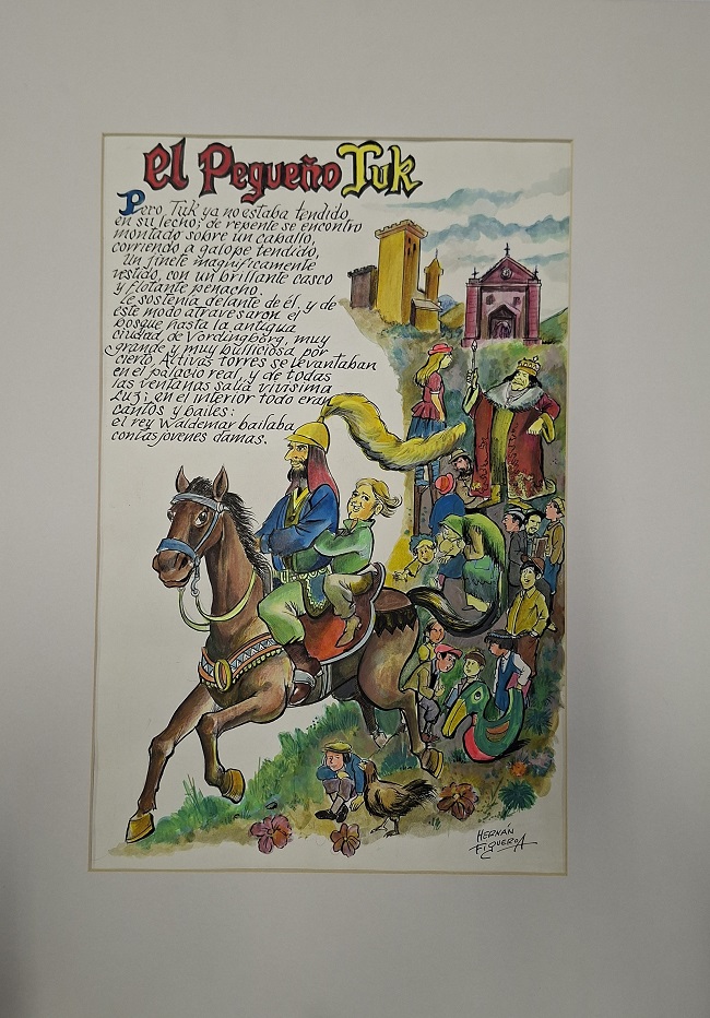 Obra visual de formato rectangular y disposición vertical. Dibujo policromado. En el primer plano de la composición dos figuras masculinas montando a caballo, de fondo diversas figuras humanas realizando distintas actividades. En el cuadrante superior izquierdo un texto.
