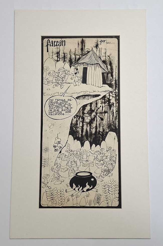 Obra visual de formato rectangular y disposición vertical. Dibujo monocromo. La composición presenta una misma escena pero con dos planos diferentes, uno en la superficie y otro en el subterráneo. En la parte de arriba, varias figuras masculinas caminando en medio de paisaje boscoso. Abajo, una multitud de figuras rodeando un objeto redondo.