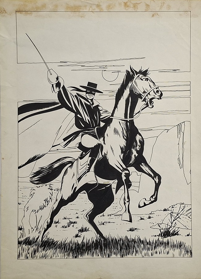 Obra visual de formato rectangular y disposición vertical. Dibujo monocromo. En el centro de la composición la figura de un hombre vestido con una capa y montando un caballo.