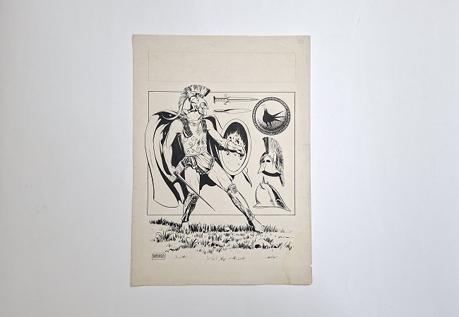 Obra visual de formato rectangular y disposición vertical. Dibujo monocromo. En el centro de la composición, la figura de un hombre vestido con armadura que incluye un casco tipo corintio, coraza anatómica y protección en las piernas. Porta un escudo redondo.