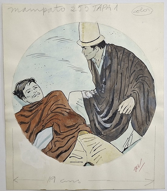 Obra visual de formato rectangular y disposición vertical. Dibujo policromado. En el centro de la composición se observan dos figuras masculinas de medio cuerpo.