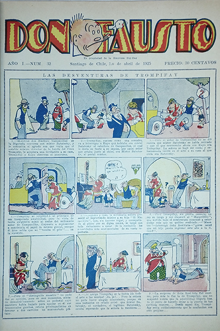"Durante las décadas de 1920 y 1930, la historieta se desarrolló principalmente en publicaciones infantiles, entre las que destacaron El Peneca (1908-1960), Chicos i grandes (1908-1909), El Pibe (1923-1931), Don Fausto (1924-1964), El Cabrito (1941-1948), Aladino (1949-1951), Simbad (1949-1956) o Álbum Mickey (1937-1938). En estas revistas participaron dibujantes como Raúl Figueroa (Chao) (1886-1948) o Jorge Christie (1916-1954). Este último, en 1938, comenzó a publicar en El Diario Ilustrado (1902-1970) las aventuras de Chu Man-Fú, la primera tira cómica de frecuencia diaria chilena."