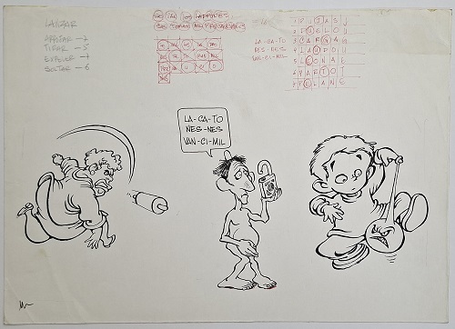 Obra visual de formato rectangular y disposición horizontal. Dibujo monocromo. En la composición se observan tres figuras masculinas de cuerpo completo realizando diferentes actividades. En la parte superior dos tablas de color rojo con letras mayúsculas.
