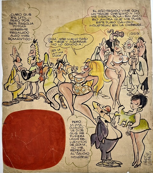 Obra visual de formato rectangular y disposición vertical. Dibujo policromado. Está compuesto por cuatro viñetas protagonizadas por varias figuras femeninas y masculinas. En el cuadrante inferior izquierdo presenta un polígono de color rojo.
