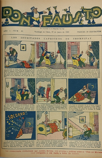"Durante las décadas de 1920 y 1930, la historieta se desarrolló principalmente en publicaciones infantiles, entre las que destacaron El Peneca (1908-1960), Chicos i grandes (1908-1909), El Pibe (1923-1931), Don Fausto (1924-1964), El Cabrito (1941-1948), Aladino (1949-1951), Simbad (1949-1956) o Álbum Mickey (1937-1938). En estas revistas participaron dibujantes como Raúl Figueroa (Chao) (1886-1948) o Jorge Christie (1916-1954). Este último, en 1938, comenzó a publicar en El Diario Ilustrado (1902-1970) las aventuras de Chu Man-Fú, la primera tira cómica de frecuencia diaria chilena."