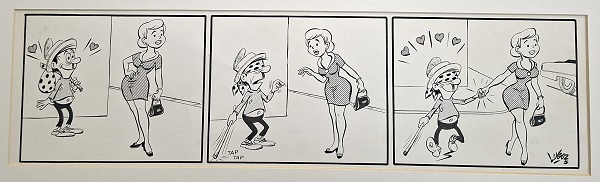 Obra visual de formato rectangular y disposición horizontal. Dibujo monocromo. Está compuesto por tres viñetas protagonizadas por una figura masculina junto a una figura femenina, realizando distintas actividades.