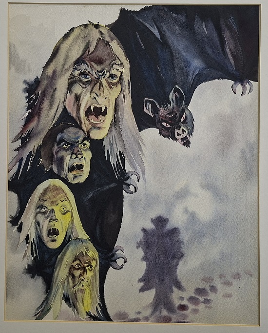Obra visual de formato rectangular y disposición vertical. Dibujo policromado. En el centro de la composición un mamífero con extremidades en forma de alas, desde la parte izquierda sobresalen cuatro rostros masculinos con distintas expresiones.