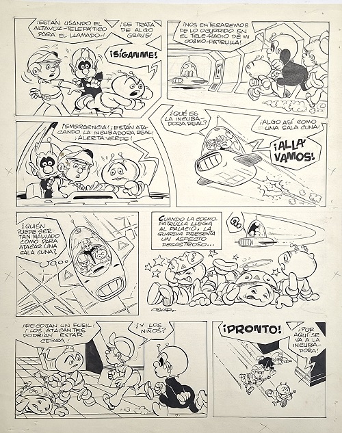 Obra visual de formato rectangular y disposición vertical. Dibujo monocromo. Está compuesto por ocho viñetas protagonizadas por una figura infantil y varias figuras antropomorfas.