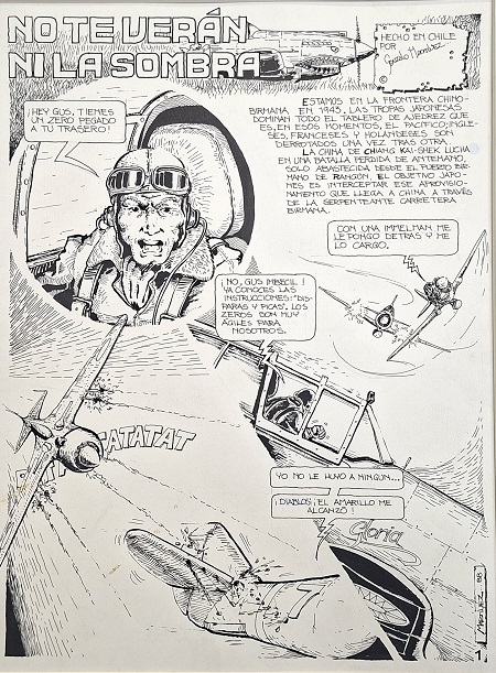 Obra visual de formato rectangular y disposición vertical. Dibujo monocromo. Está compuesto por tres viñetas protagonizadas por una figura masculina vestido de aviador.