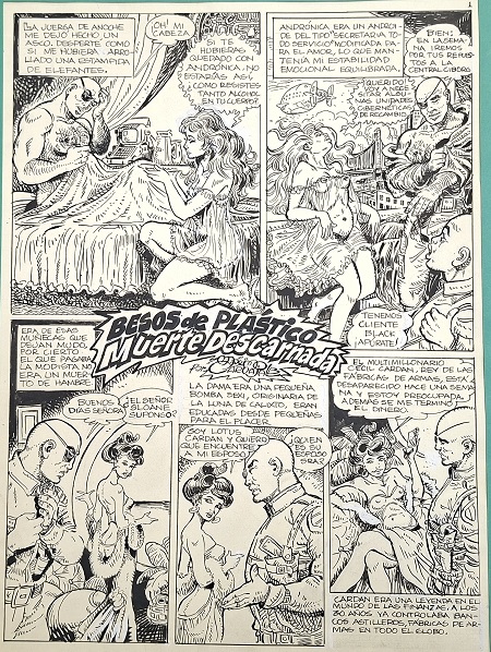 Obra visual de formato rectangular y disposición vertical. Dibujo monocromo. Está compuesto por cinco viñetas protagonizadas por varias figuras femeninas y masculinas.