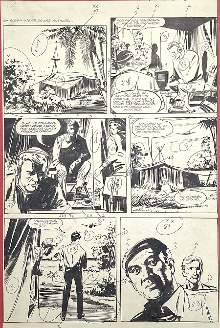 Obra visual de formato rectangular y disposición vertical. Dibujo monocromo. Está compuesto por seis viñetas protagonizadas por varias figuras masculinas. Tiene indicaciones de color.