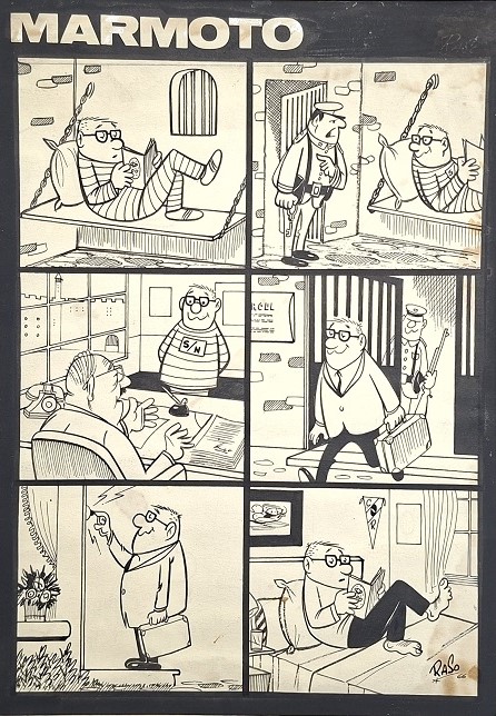 Obra visual de formato rectangular y disposición vertical. Dibujo monocromo. Está compuesto por seis viñetas protagonizadas por varias figuras masculinas realizando distintas actividades.