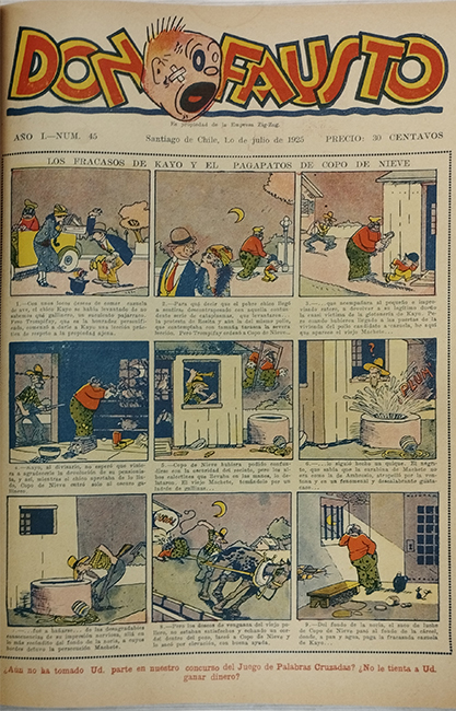 "Durante las décadas de 1920 y 1930, la historieta se desarrolló principalmente en publicaciones infantiles, entre las que destacaron El Peneca (1908-1960), Chicos i grandes (1908-1909), El Pibe (1923-1931), Don Fausto (1924-1964), El Cabrito (1941-1948), Aladino (1949-1951), Simbad (1949-1956) o Álbum Mickey (1937-1938). En estas revistas participaron dibujantes como Raúl Figueroa (Chao) (1886-1948) o Jorge Christie (1916-1954). Este último, en 1938, comenzó a publicar en El Diario Ilustrado (1902-1970) las aventuras de Chu Man-Fú, la primera tira cómica de frecuencia diaria chilena."