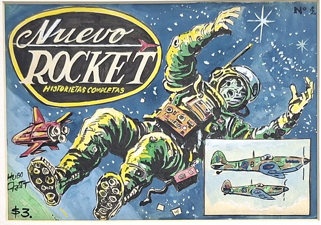 Obra visual de formato rectangular y disposición horizontal. Dibujo policromado. En el primer plano de la composición una figura masculina con un traje espacial.