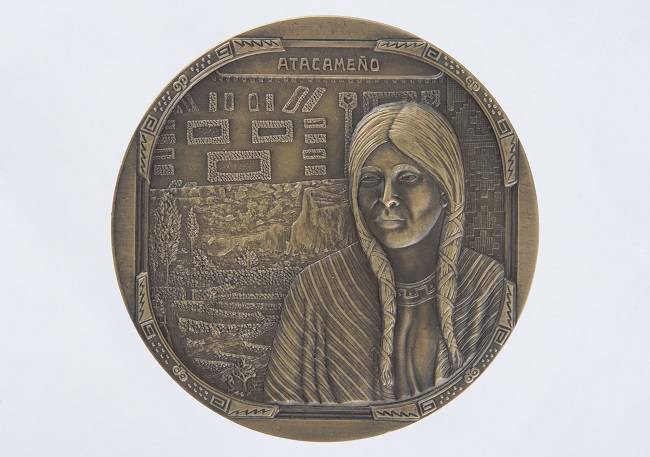 Medalla circular de bronce acuñada. En su anverso presenta la imagen de una figura humana al lado derecho. En un tercer plano hay una representación de un paisaje altiplánico con decorativos geométricos en la parte superior. Sobre el cual se encuentra inscrita la palabra: ATACAMEÑO. Rodeando la imagen central, hay un borde de patrones geométricos.