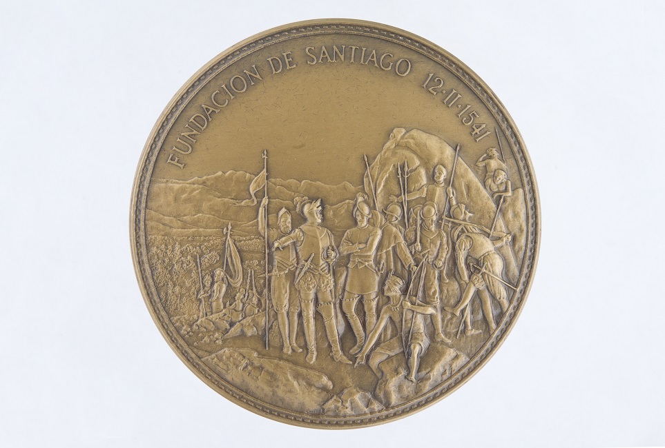 Medalla circular de bronce acuñada. En el anverso presenta la imagen de quince figuras masculinas sobre una colina en diferentes planos. Y en la parte superior en forma de arco la leyenda: FUNDACION DE SANTIAGO 12.II.1541. En el reverso se encuentra un símbolo heráldico.